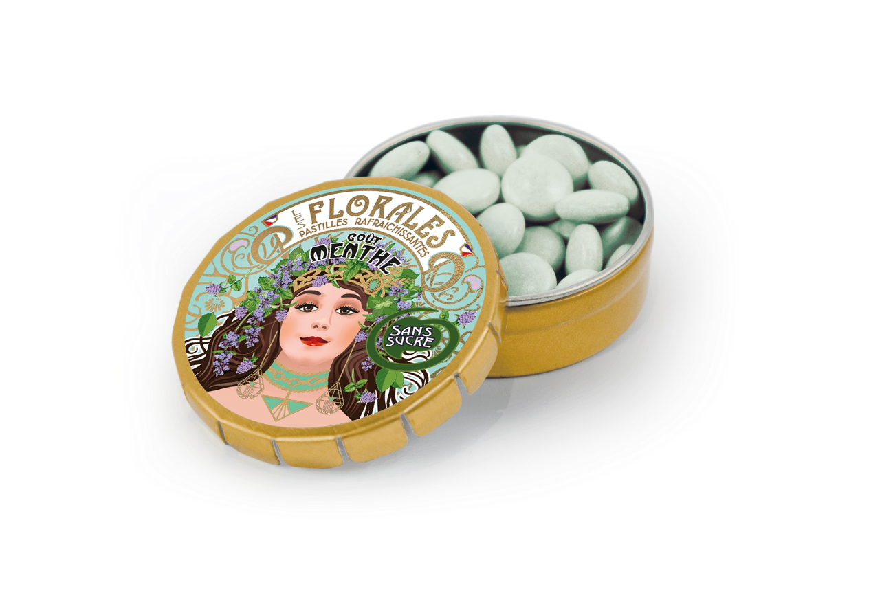 Οι Παστίλιες Les Florales μέντα χωρίς ζάχαρη προσφέρουν δροσερή αναπνοή και εκλεπτυσμένη αισθητική σε μια μικρή, στρογγυλή μεταλλική συσκευασία. Το εξωτερικό της συσκευασίας ξεχωρίζει χάρη στο ιδιαίτερο design, όπου απεικονίζονται γυναικεία πρόσωπα εμπνευσμένα από την Art Nouveau. Στο mprikidelishop.gr μπορείτε να τις βρείτε εύκολα και να τις έχετε πάντα μαζί σας. Πρώτον, προσφέρουν έντονη αίσθηση μέντας. Δεύτερον, δεν περιέχουν ζάχαρη, ως εκ τούτου αποτελούν ιδανική επιλογή για καθημερινή χρήση.