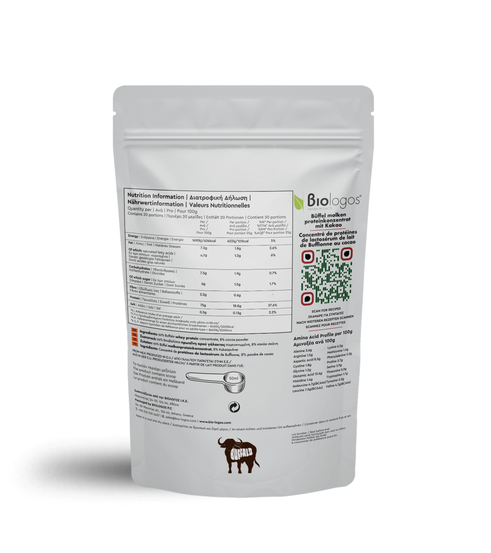 Η Βιολόγος Πρωτεΐνη Buffalo Whey Choco 500γρ προσφέρει υψηλής ποιότητας πρωτεΐνη με πλούσια, φυσική γεύση σοκολάτας. Οι παραγωγοί την παρασκευάζουν από 100% γάλα βουβαλιού, προερχόμενο από φάρμες στην Ιταλία που εφαρμόζουν βιώσιμες πρακτικές εκτροφής. Τα βουβάλια ζουν σε ανοιχτούς χώρους και τρέφονται φυσικά, γεγονός που ενισχύει τη θρεπτική αξία του γάλακτος. Ως αποτέλεσμα, η πρωτεΐνη διαθέτει πλούσιο προφίλ και ανώτερη διατροφική αξία.