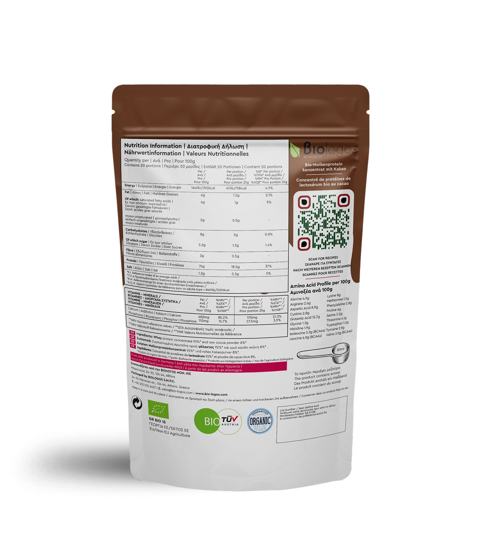 Η Βιολόγος Πρωτεΐνη Ορού Γάλακτος Κακάο 500γρ προσφέρει φυσική ενίσχυση στη διατροφή με υπέροχη σοκολατένια γεύση. Περιέχει 100% βιολογικό ορό γάλακτος από αγελάδες ελευθέρας βοσκής σε πιστοποιημένες φάρμες της Γερμανίας. Ο συνδυασμός με περουβιανό κακάο ενισχύει τη γεύση και χαρίζει ένα απολαυστικό αποτέλεσμα.